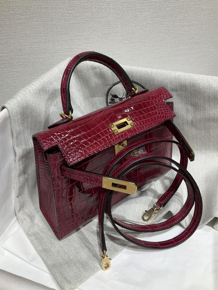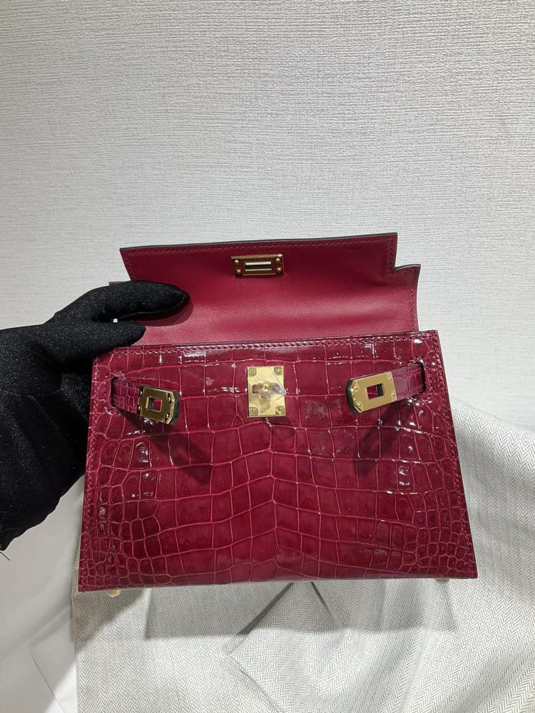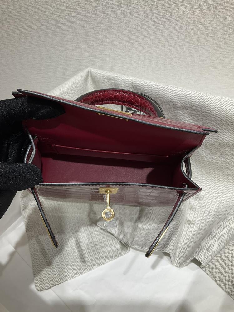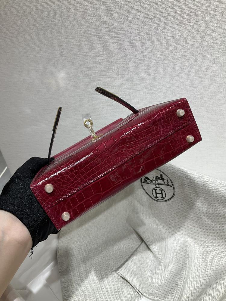 The ultimate symbol of elegance — Hermès Kelly Mini 19cm (2nd Generation) in Wine Red glossy crocodile leather 🐊, finished with luxurious gold hardware.